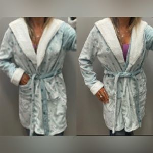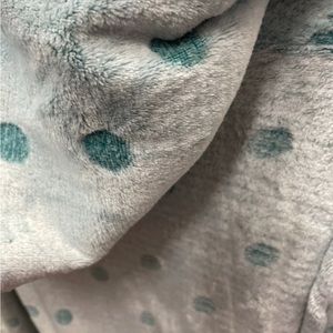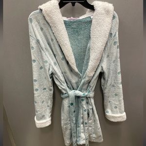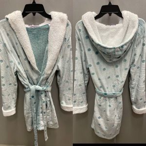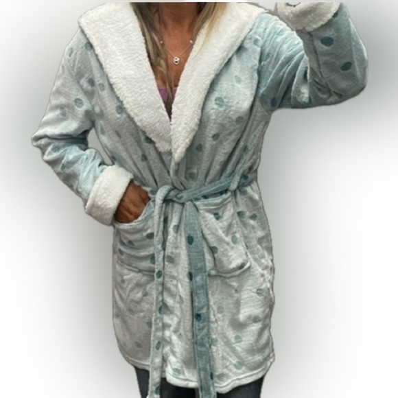 Cute fluffy hooded polkadot robe color teal, one size fits most. Drawstring waist has pockets. In excellent used condition no stains tears or damage smoke-free pet free home