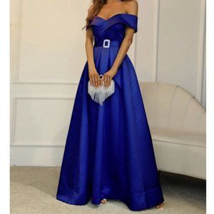 Chic Off Shoulder Boxy Pleated Split Thigh Prom Maxi Dress Blue