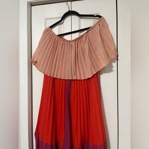 Elevate your wardrobe with this chic off-shoulder midi dress. Featuring a beautiful blend of pink, red, and purple, this dress is perfect for any occasion.