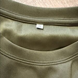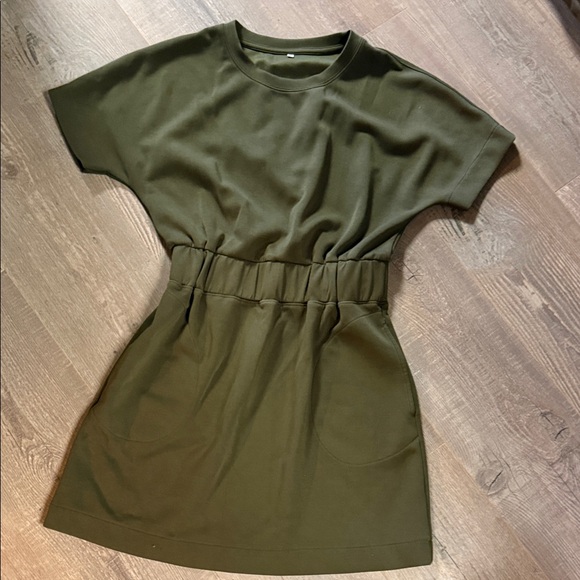 Elegant olive green dress featuring short sleeves and a flattering elastic waist. Ideal for casual wear.