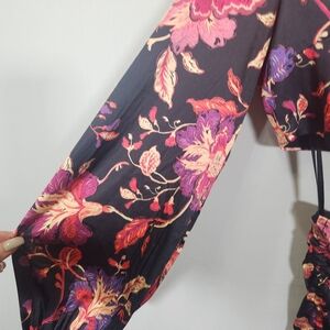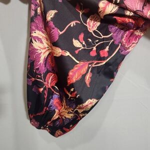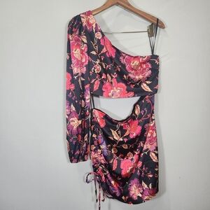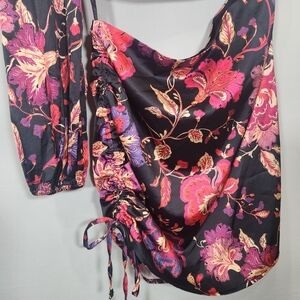 Turn heads with this chic one shoulder dress, featuring a vibrant floral design. The black base is beautifully accented with pink flowers, perfect for any stylish occasion. please veiw last photo for fraying on the fabric near the zipper, barely noticeable.