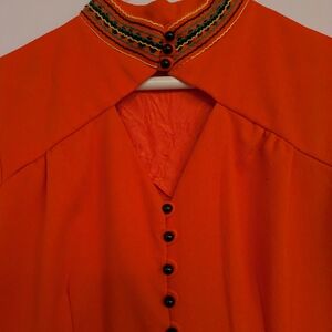 This orange mini dress features a stylish button-front design, perfect for any occasion. Its vibrant color adds a pop of style to your wardrobe. Slight cut-out at neckline gives some retro flair.