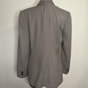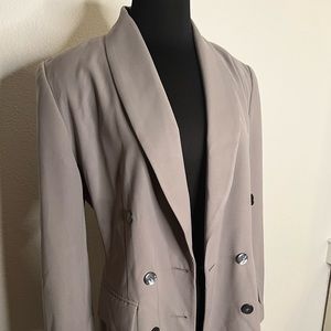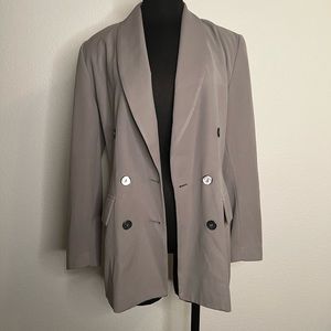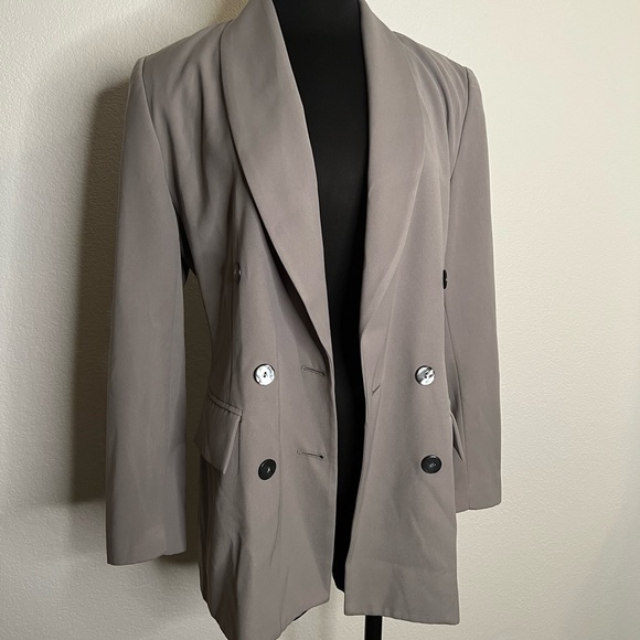 Super trendy oversized blazer! Taupe color (not quite as great as the pictures make it look) I’m 5’4” and it just barely goes past my butt. It fits really great with just the slightest little bit of a sleeve puff.