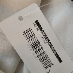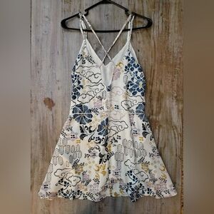 NWT Step out in style with this chic patterned mini dress. The cross-back design and elegant cream, blue, and gold colors make it a standout piece for any event. Tie waste with cute tassel detail. Can be dressed up or down.