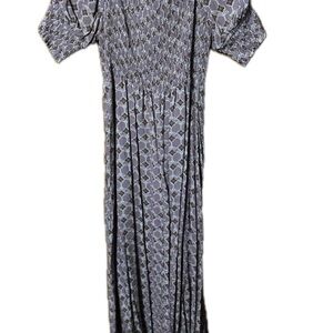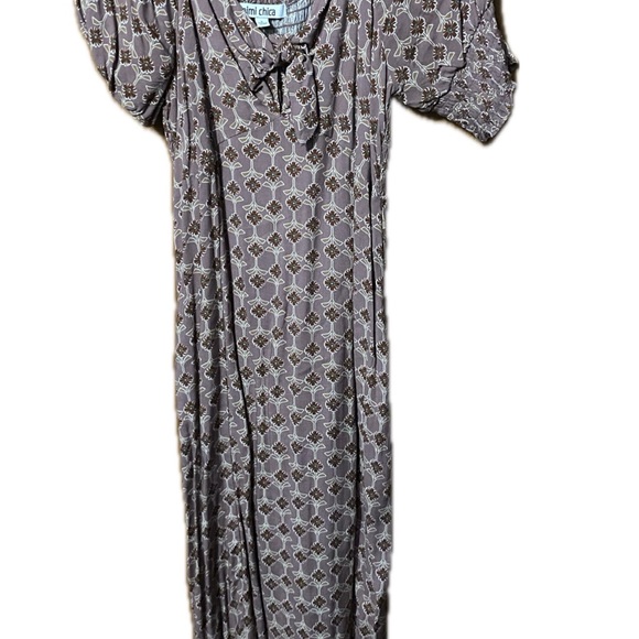 Stylish dress with a chic pattern. Features a tie detail at the neckline. Perfect for casual outings.