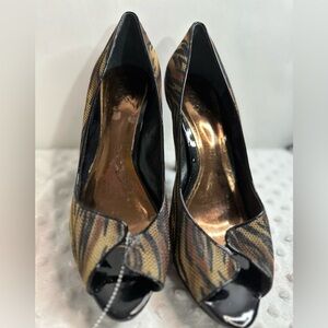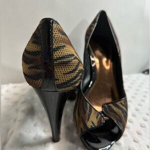 Elevate your look with these chic peep-toe heels. The striking black and gold design adds a touch of glamour to any outfit.