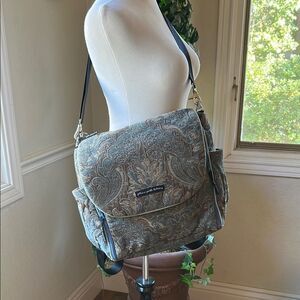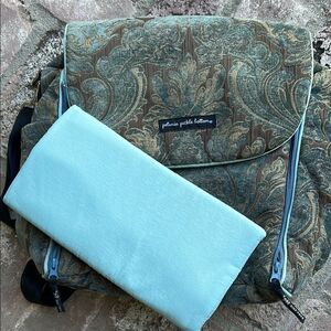 This stylish baby bag features a quilted design in blue and brown offering a chic and practical solution for carrying essentials. With its spacious interior and adjustable shoulder strap, it ensures comfort and convenience for everyday use. Can be worn as a backpack or shoulder bag. Pad included. Please look at all pictures. A couple of light pink spots on inside see pictures.