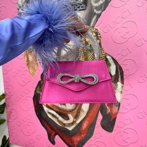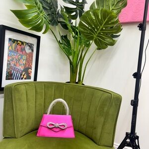 This vibrant pink mini bag is a stylish accessory with a structured rectangular shape and a striking gold bow accent. Its compact size and sleek design make it perfect for adding a touch of elegance to any ensemble.