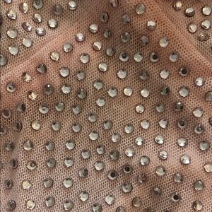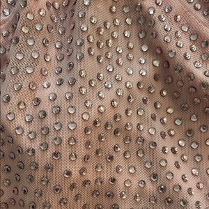 Worn once. One little rhinestone is missing from the front but you can’t notice. The tag is almost off and at this point I would just cut it off with no harm done. Leaving it alone in the meantime.