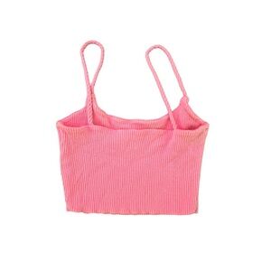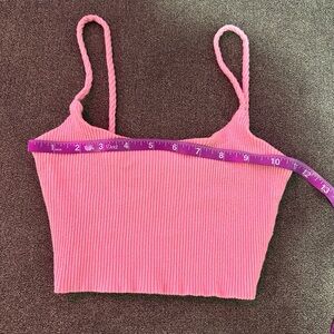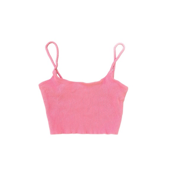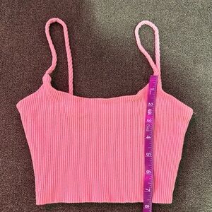 Chic pink ribbed crop top with twisted straps. Ideal for casual outings.