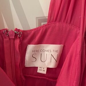 Chic pink gown with elegant ruching. Ideal for formal events.