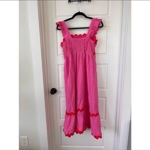 Step out in style with this chic pink midi dress, featuring elegant ruffle details. Perfect for any occasion.