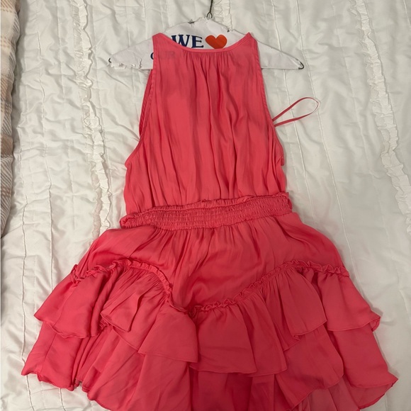 Elegant pink dress with ruffled layers. Perfect for any occasion. Sleeveless design adds a stylish touch.