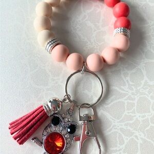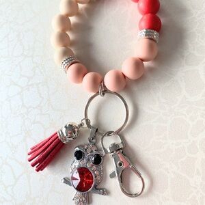 Add a pop of color to your or your child's accessories with this chic pink and red beaded keychain wristlet bracelet. Featuring a playful tassel and a fun owl charm, it's perfect for backpacks or