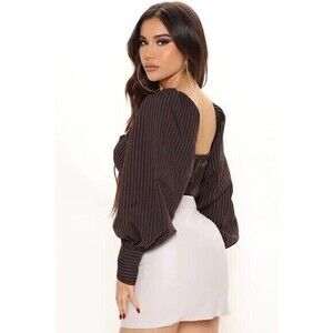 Chic Pinstripe Balloon Sleeve Smocked Back Brown Top Size Large RefM004