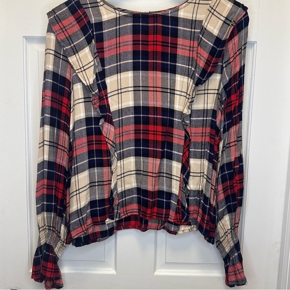 Elevate your style with this chic plaid blouse featuring elegant ruffle details. The blend of red, navy, and cream colors offers a timeless look.
