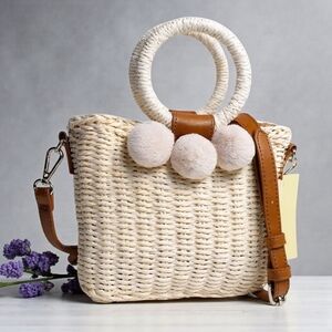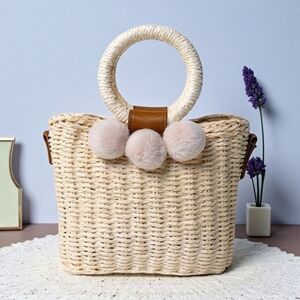 Embrace style and versatility with this Chic Pom-Pom Straw Trendy Bucket Bag 👜, a delightful accessory designed to carry you from sunny days to festive evenings effortlessly! This charming bag is adorned with three fluffy pom-poms, adding a dash of fun to any outfit. Crafted with a robust straw weave and lined for added durability, it's both stylish and practical. Features an adjustable PU leather crossbody strap for customized comfort and a magnetic button closure to securely store your essentials.