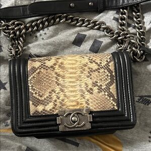 Elevate your style with this chic crossbody bag featuring luxurious python leather. The elegant black trim and chain strap add a touch of sophistication. Perfect for any occasion. The inside tag is gone so I can put no name it’s vintage please check the pictures