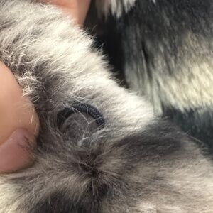 Stylish rabbit fur jacket with bold stripes. Features a mix of black, gray, and cream colors. Perfect for a trendy look. Size small. Hook and eye closure