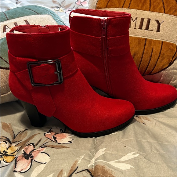 Elevate your style with these chic red ankle boots. Featuring a bold buckle design, they add a striking touch to any ensemble.