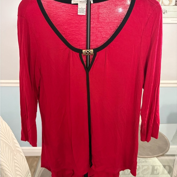 Elevate your style with this chic red blouse featuring sleek black trim. Perfect for any occasion, this top adds a bold touch to your wardrobe.