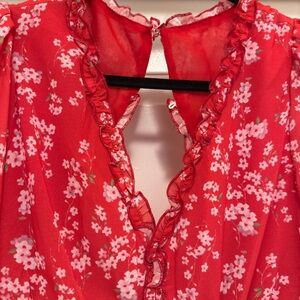 Step out in style with this chic red floral mini dress. Featuring delicate ruffles and a vibrant floral pattern, it's perfect for any occasion.