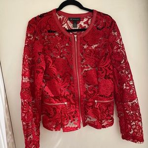 Never worn red lace jacket with red leather trim & silver zippers.