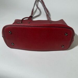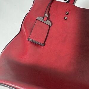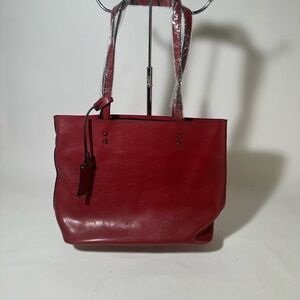 This vibrant red tote bag, crafted from high-quality leather, features a spacious trapezoid silhouette. Its sleek design and sturdy straps make it an ideal choice for both casual outings and formal events.