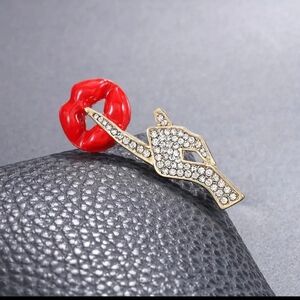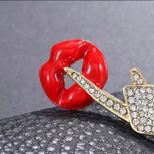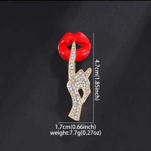 Cute metal brooch pin has gorgeous red lips and rhinestone accents. Perfect for parties and everyday glam.