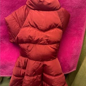 Elegant red puffer jacket with a stylish design. Perfect for staying warm and fashionable.