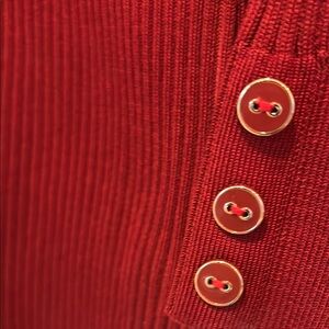 Elegant red ribbed two-piece set with button accents on sleeves. Ideal for versatile styling.