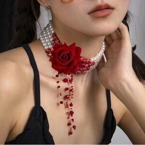 This chic necklace features a striking red rose surrounded by elegant pearls, perfect for enhancing any ensemble with a touch of elegance.