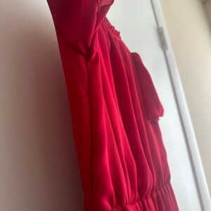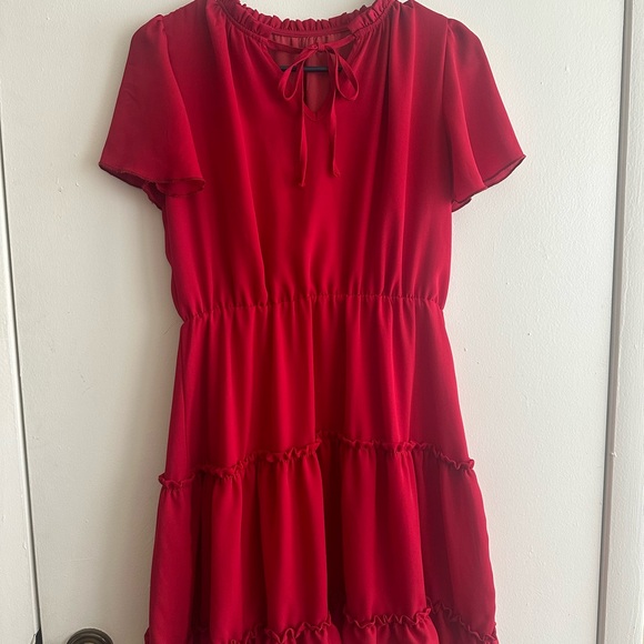 Elegant red dress with ruffle details. Perfect for any occasion.