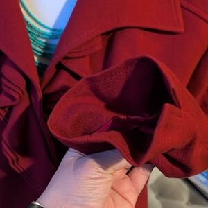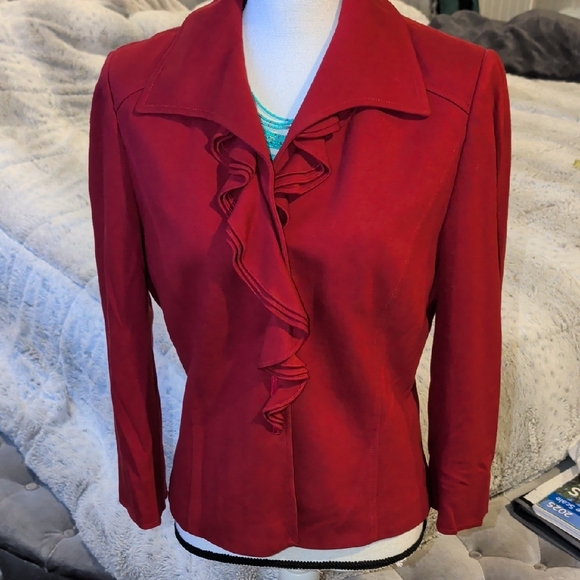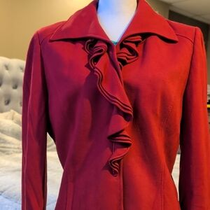 Elevate your wardrobe with this chic red blazer featuring a stylish ruffle design. Perfect for adding a touch of elegance to any ensemble.