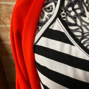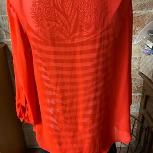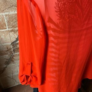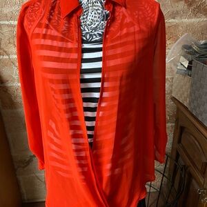 Stylish sheer blouse in vibrant red. Black and white striped shell attached. Perfect for spring and summer. new without tags .button up sleeve .free gift for this purchase . smoke-free environment, measurements in photos. Fast shipping.