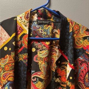 This vibrant blouse features a stunning blend of red and orange hues, perfect for making a bold statement. Its elegant design and comfortable fit make it a versatile addition to any wardrobe. Ideal for both casual outings and special occasions.