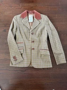 Stylish checked blazer with a rust velvet collar. Features a tailored silhouette, front buttons, and piped pockets for a refined finish. Versatile cream and rust tones make it easy to pair with casual or dressy outfits. Lightweight construction for all-day comfort.
