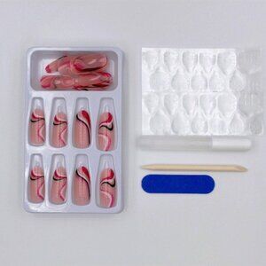 Chic Rounded Press-On Nails with Pink, Black & Fuchsia Swirls