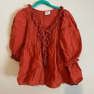 Elevate your style with this chic rust blouse featuring delicate ruffles and a charming tie-front. Perfect for versatile wear.