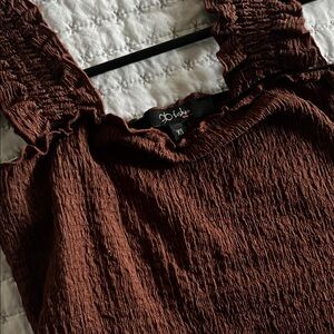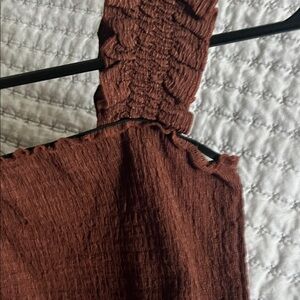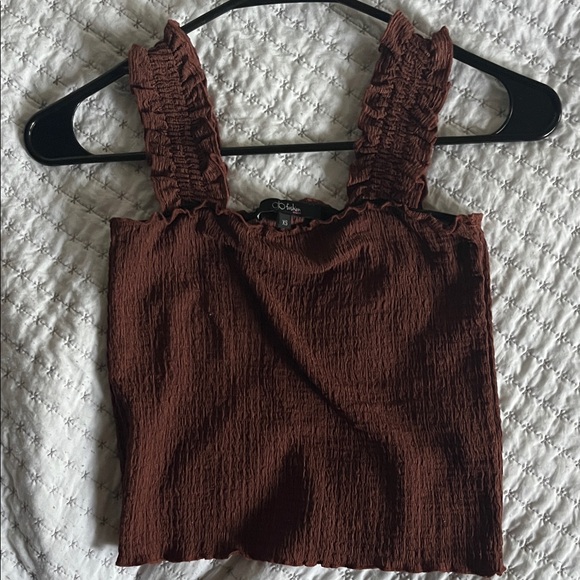Stylish brown crop top with ruffled straps. Perfect for casual outings.