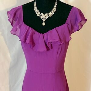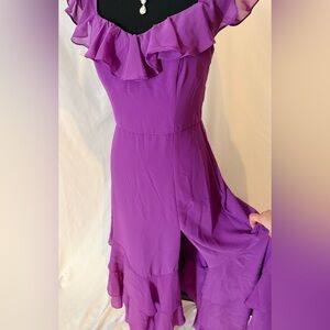 Step out in style with this chic high-low dress featuring elegant ruffles. The vibrant purple color adds a pop of sophistication to your look. Adjustable shoulder straps. Side zip. #32