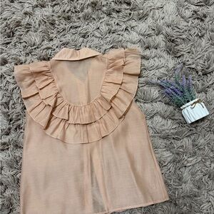 This chic tan blouse features elegant ruffles for a stylish look. Perfect for any occasion.