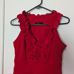 Turn heads with this chic scarlet knee length dress, featuring playful ruffle accents. Perfect for adding a pop of color to your wardrobe.
