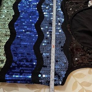 Stylish tank top with shimmering sequins. Features black, blue, and green stripes. Perfect for a night out.