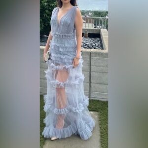Absolutely stunning layered tulle gown in a soft smoky grey tone. This dress features a deep V-neckline with delicate sheer detailing and a flattering fitted bodice.