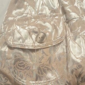 Elevate your style with this chic silver floral trench coat. Perfect for any occasion, this coat adds a touch of elegance to your wardrobe. Silver and champagne damask fabric. Asymmetrical buttoned front. Large collar. 2 front buttoned pockets. Back vent. 3/4 length sleeves with. Button tab and sleeves with 2 2-button band on sleeves. Fully finished inside. Hip length. Never worn in New condition.