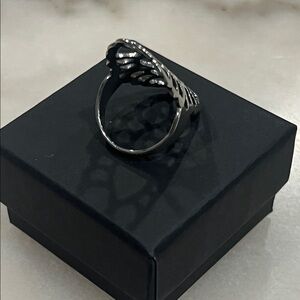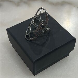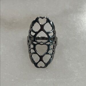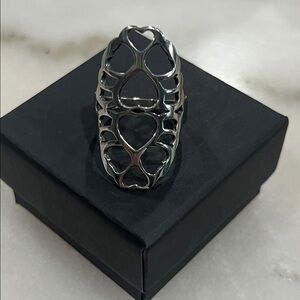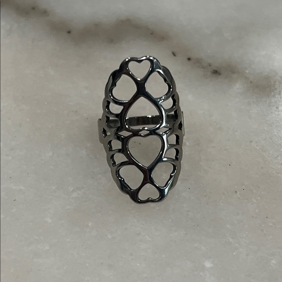 This chic silver ring features an intricate heart pattern, perfect for adding elegance to any ensemble.