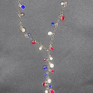 This chic silver necklace is adorned with striking red and blue accents, making it a perfect accessory to elevate any ensemble. Its stylish design ensures versatility for any occasion.