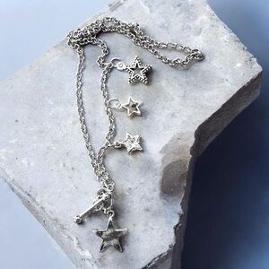Chic Silver toned Star Necklace with cubic zirconia star toggle closure 16” Stylish silver toned stainless steel necklace with charming star pendants. Can be layered with other necklaces.