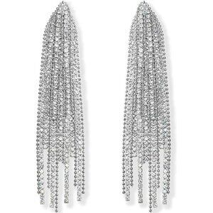 These rhinestone tassel earrings boast long, layered chains of CZ crystals cascading from a stud post. With captivating geometric shapes, the dangling fringes gracefully sway and sparkle with every movement.